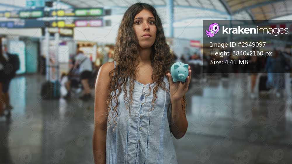 Hispanic teenage girl holding a blue piggybank with her right hand at chest height, worried face and tense posture in a busy airport terminal; financial anxiety. - Kraken Images