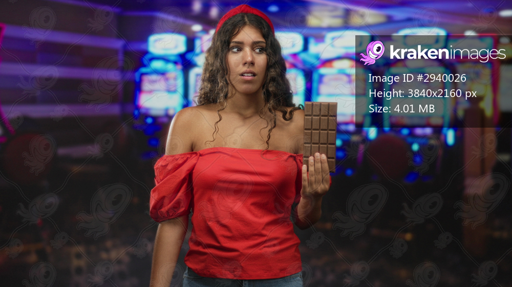 Hispanic teenage woman with bare shoulders holds a chocolate bar and shows a conflicted frown in a building; temptation uncertainty.