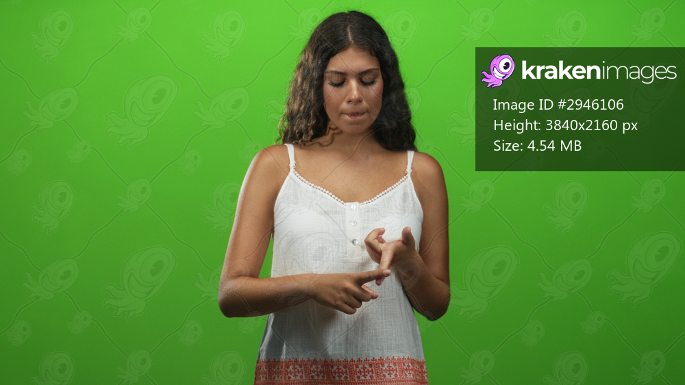 Hispanic teenage woman counting fingers and tapping thumb while looking down in green screen studio; contemplation focus.