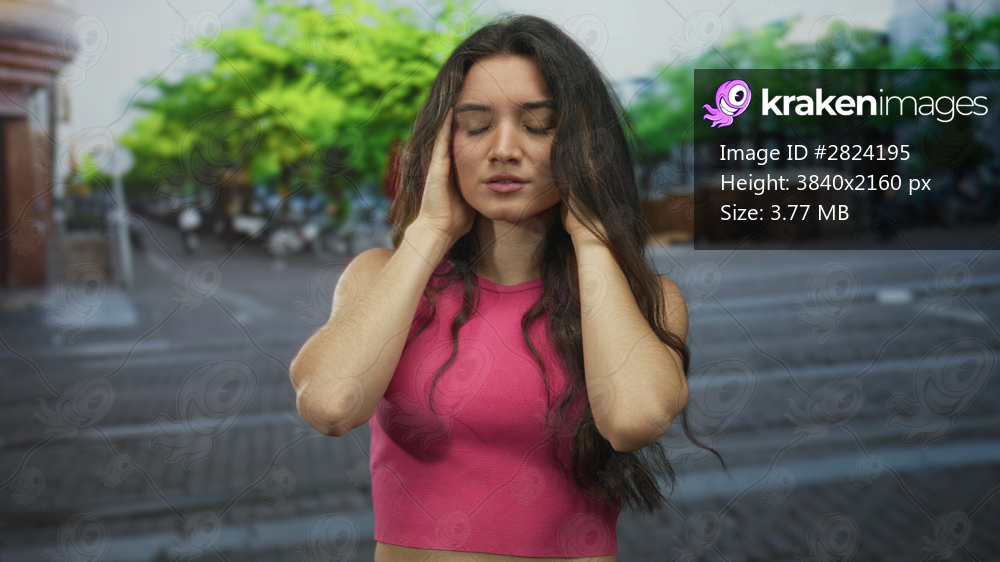 Hispanic teenage woman cups cheeks with closed eyes on sunlit urban street with bicycles and trees; pain.
