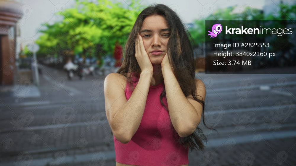 Hispanic teenage woman cups cheeks with closed eyes on sunlit urban street with bicycles and trees; pain.