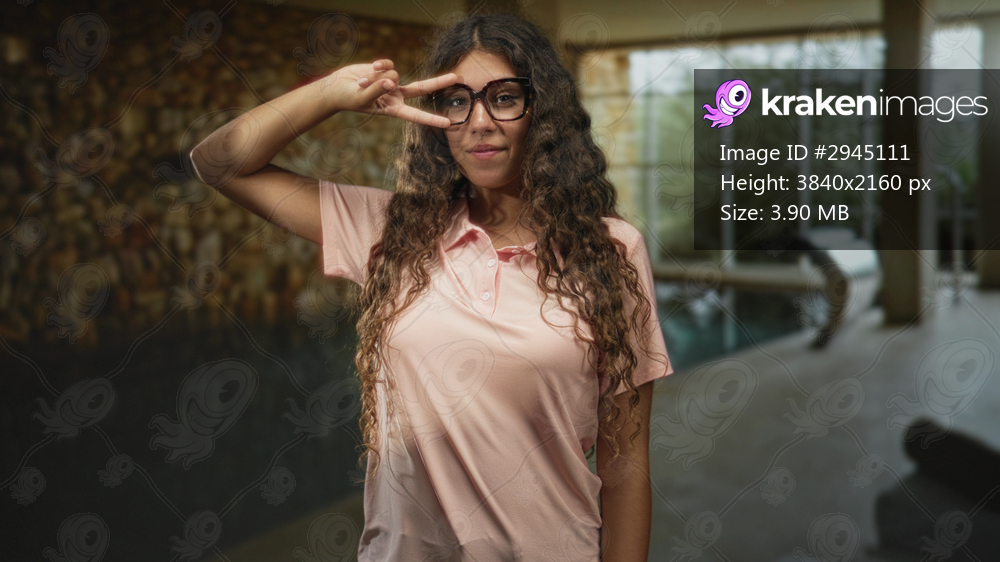 Hispanic teenage woman with glasses flashing peace sign beside indoor pool and stone wall; playful relaxation.