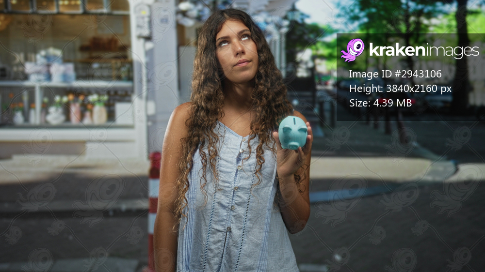 Hispanic teenage woman holding a blue piggy bank with one hand in front of a street storefront, looking at camera; saving contemplation.