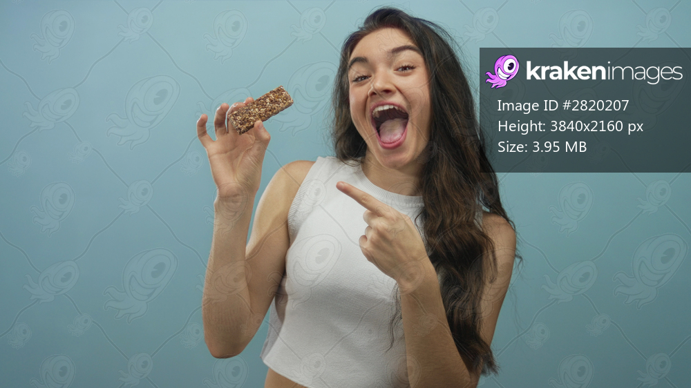 Hispanic teenage woman holding a granola bar and pointing finger with a wide smile in a blue studio; healthy snack joy.