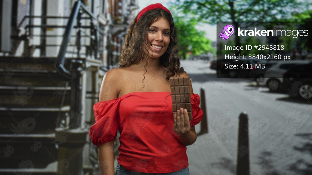 Hispanic teenage woman holding a large chocolate bar, bare shoulder visible, wearing red top and headband on a street near parked cars; playful joy.