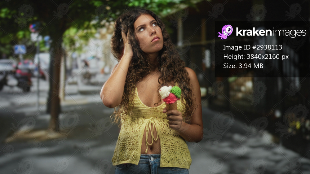 Hispanic teenage woman holding a triple scoop ice cream cone touches hair while gazing upward on a city street; contemplation.