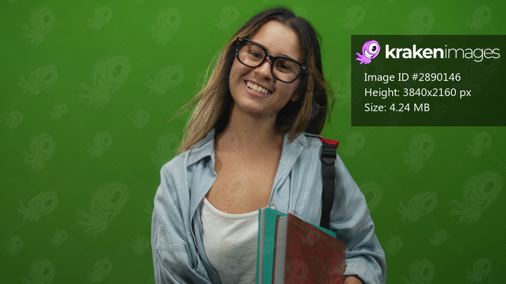 Hispanic teenage woman holding books in green studio with shoulder strap and slight smirk visible; curious resilience.
