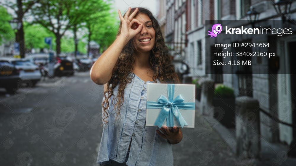 Hispanic teenage woman holding gift box with blue ribbon, making ok sign to eye on street; celebration joy.