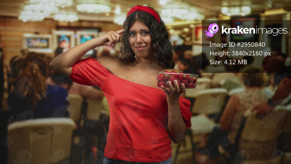 Hispanic teenage woman holds a container of strawberries and points finger to head in a building auditorium with seated audience wearing red top; playful. - Kraken Images