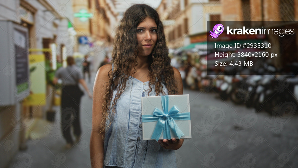 Hispanic teenage woman holds a gift box with outstretched hand on a crowded street, presenting a blue ribboned present; disappointment.