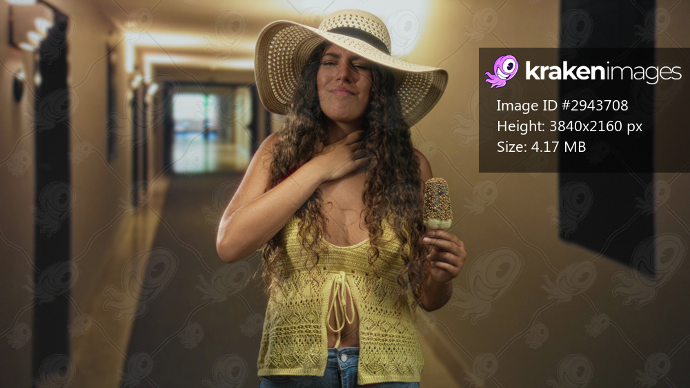 Hispanic teenage woman holds a sprinkled ice cream bar and presses hand to chest while wincing in a building corridor; nausea concern.