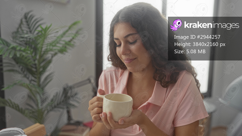 Hispanic teenage woman holds ceramic mug with both hands, gentle smile while seated in studio; morning calm.