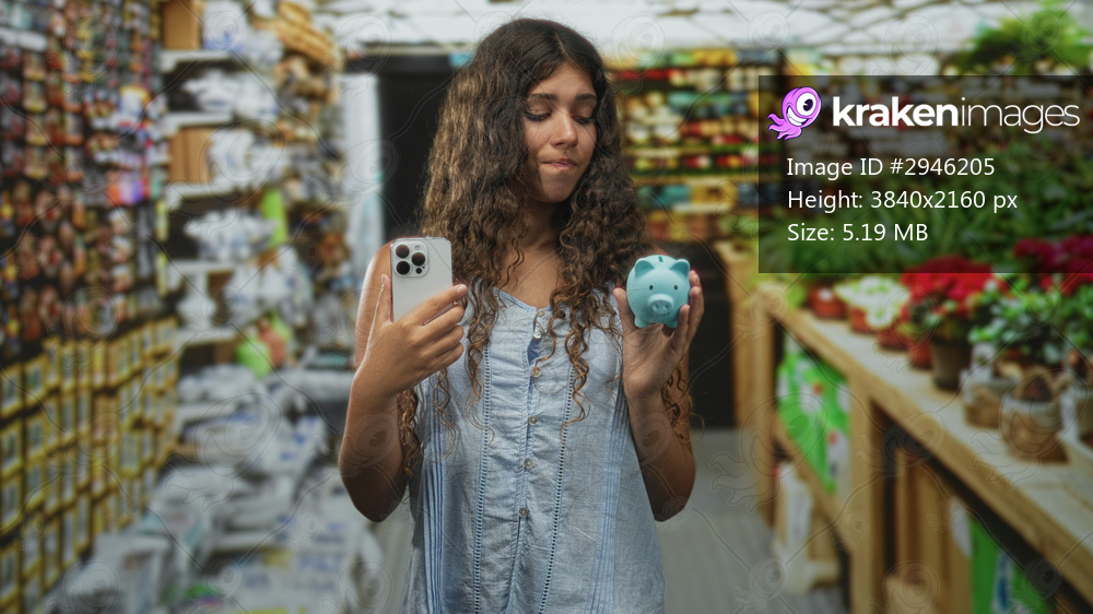Hispanic teenage woman holds smartphone and piggy bank, hands visible, inside a retail store building, plants and shelves around; financial worry.