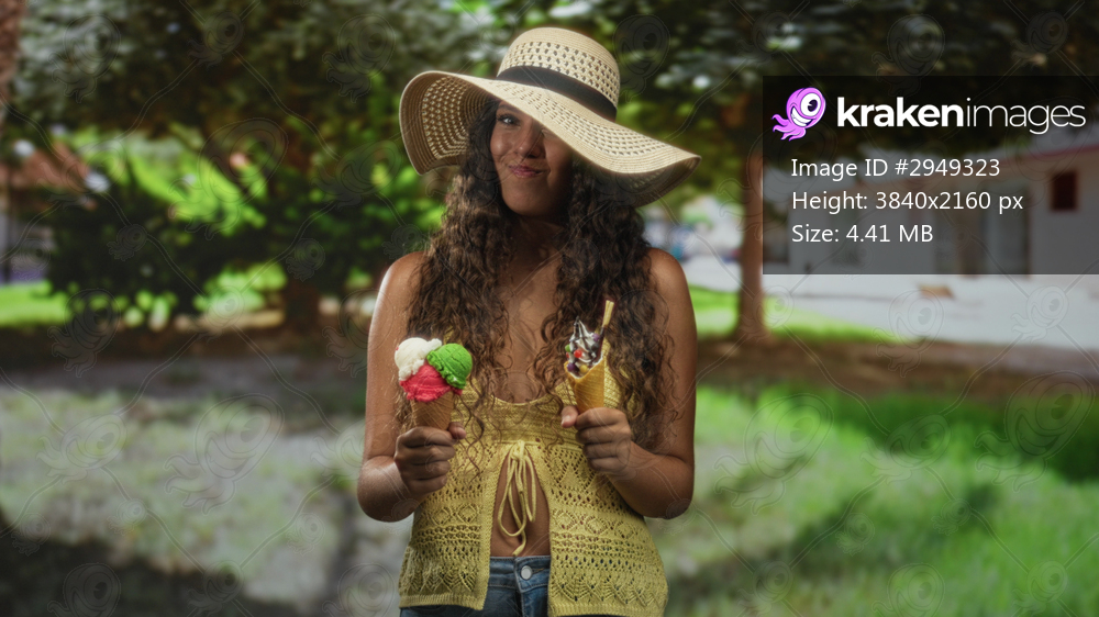 Hispanic teenage woman holds two ice cream cones with hands visible, wearing sun hat and crochet top, standing by building; summer joy.