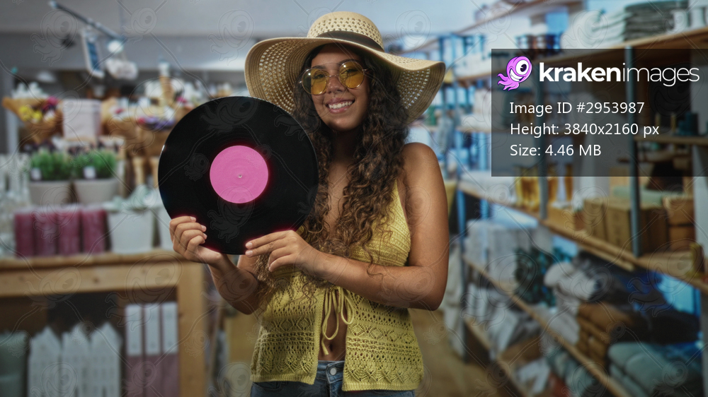 Hispanic teenage woman holds vinyl record with both hands, wearing sun hat and yellow sunglasses while smiling in a retail building; nostalgia.