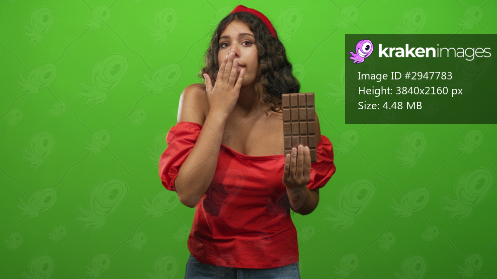 Hispanic teenage woman in red top holding large chocolate bar, hand to mouth gesture, standing before green screen in studio; nervous craving.