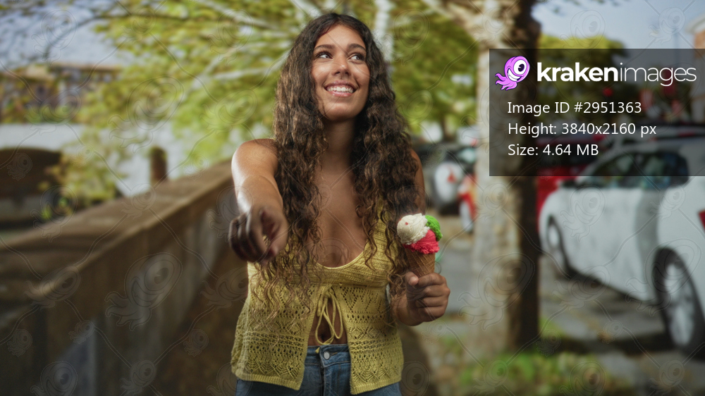 Hispanic teenage woman with long curly hair in yellow crochet top holds a three scoop ice cream cone and points finger while smiling on street near parked cars; summer joy carefree. - Kraken Images