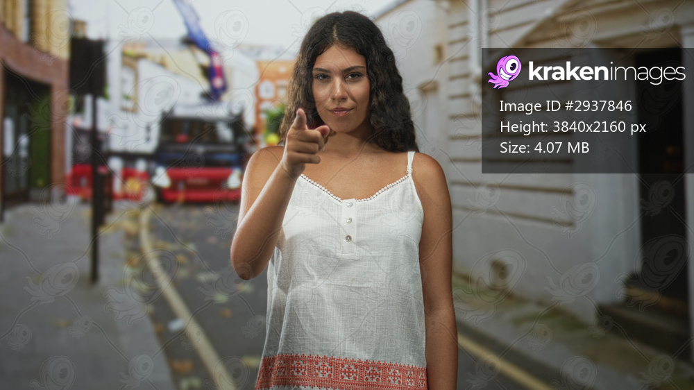 Hispanic teenage woman pointing finger at camera in white sundress on narrow city street with bus behind and building facade visible; confidence.