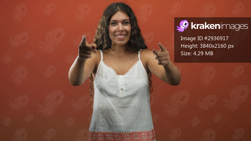 Hispanic teenage woman pointing fingers at camera in studio while smiling and wearing a white camisole; playful friendly.