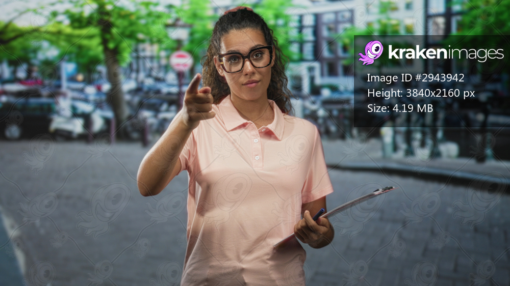 Hispanic teenage woman points finger to temple while holding clipboard and pen on a cobbled city street by canal, wearing glasses and polo; instructional confidence. - Kraken Images