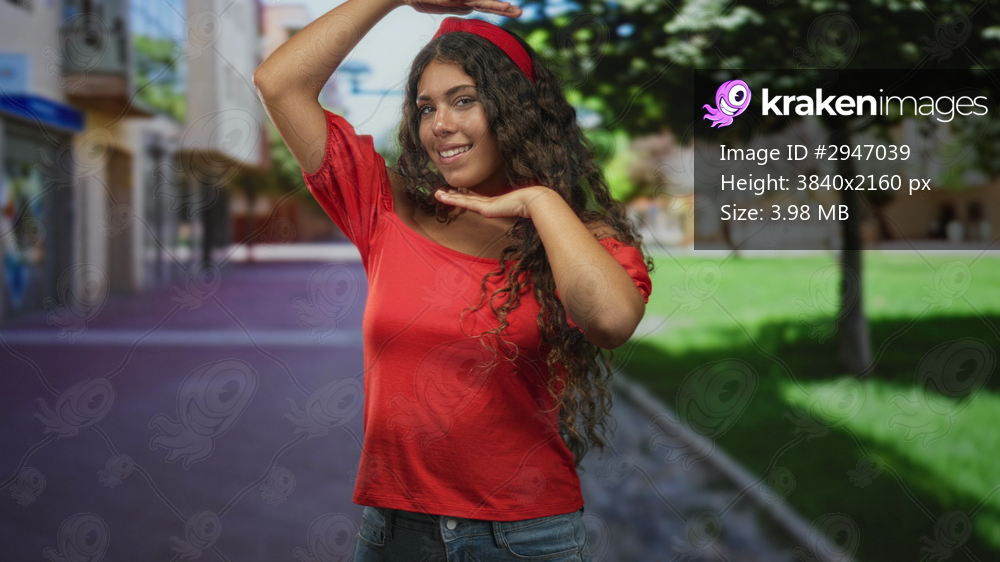 Hispanic teenage woman smiling with hands raised in a red top on street near trees and shops; carefree joy.