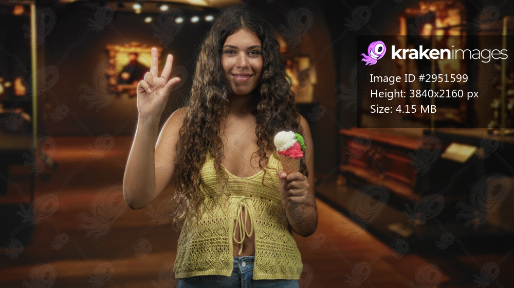 Hispanic teenage woman smiling, holding ice cream cone in right hand and raising three fingers with left hand in museum gallery; youthful joy.