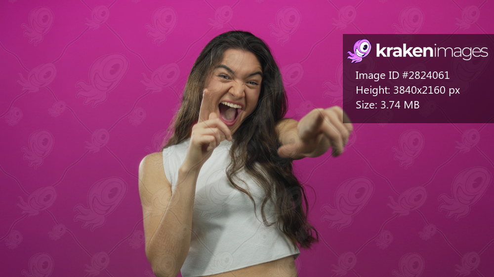 Hispanic teenage woman smiling and pointing finger to camera in bright pink studio; playful confidence.