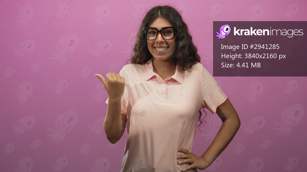 Hispanic teenage woman smiling points thumb to side in pink studio with hand on hip and glasses; playful confidence.