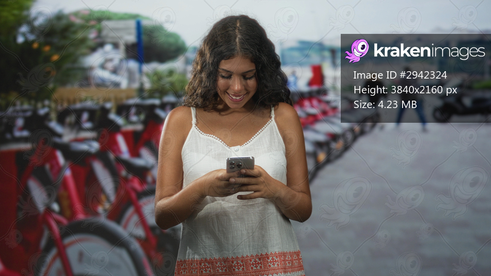 Hispanic teenage woman smiling while texting on smartphone in street bike rental station among parked red bikes; connection joy.