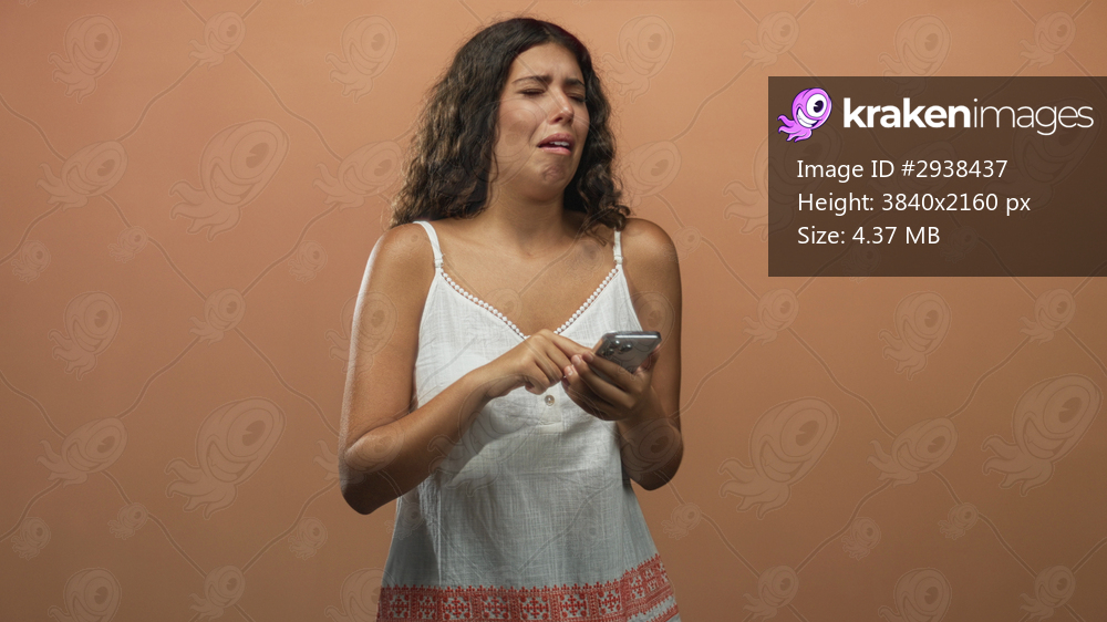 Hispanic teenage woman taps smartphone with tearful face and hand on phone in studio; heartbreak sadness.