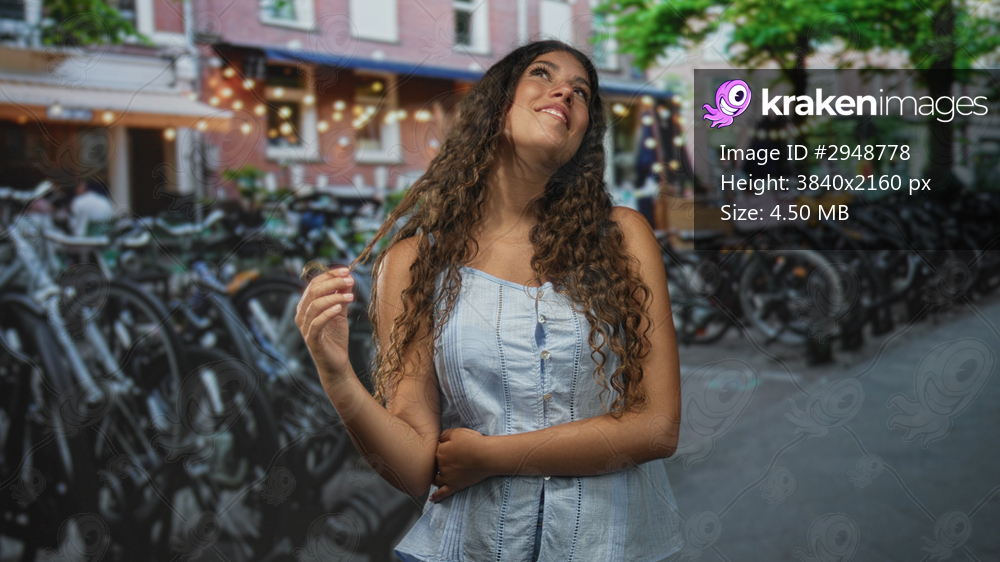 Hispanic teenage woman touching hair with right hand, smiling and looking up on a street with bicycle racks and cafe building; serenity confidence.