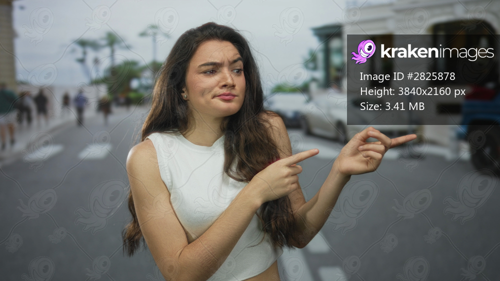 Hispanic teenage woman wearing white crop top finger pointing to object on busy city street crosswalk; uncertainty.