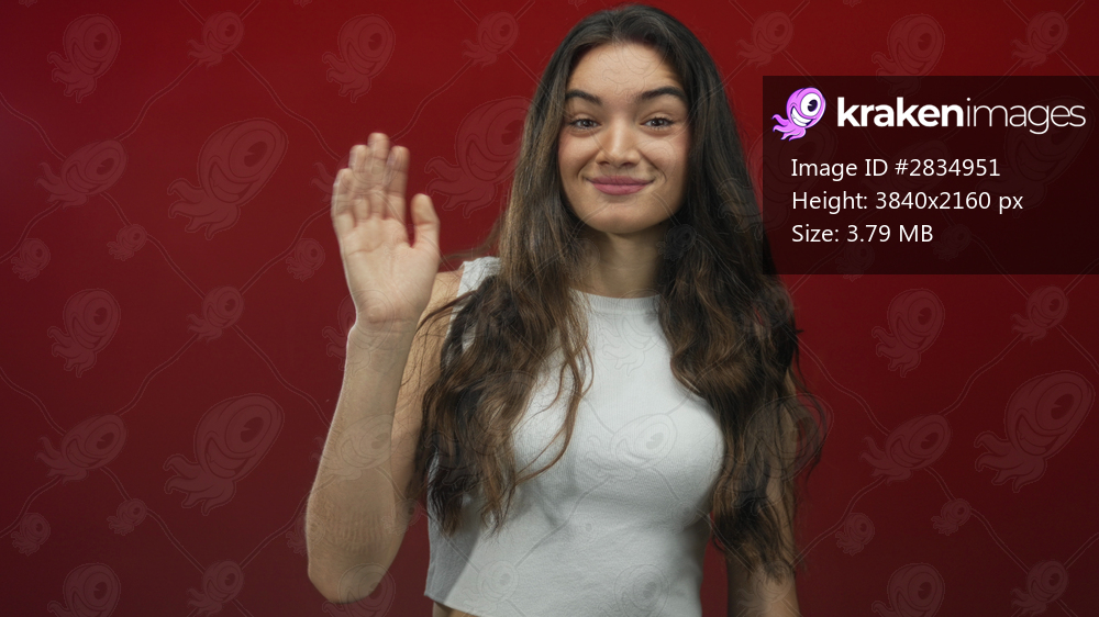 Hispanic teenage woman wearing white tanktop smiling and waving hand in studio with long dark hair; greeting warmth.