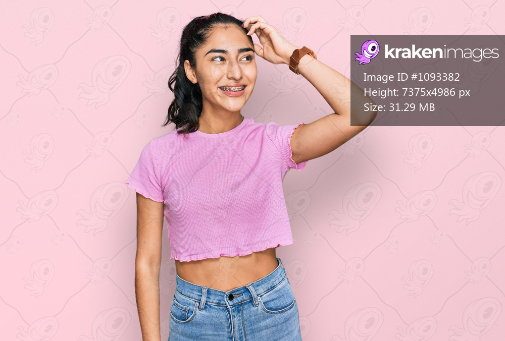Hispanic teenager girl with dental braces wearing casual clothes smiling confident touching hair with hand up gesture, posing attractive and fashionable - Kraken Images