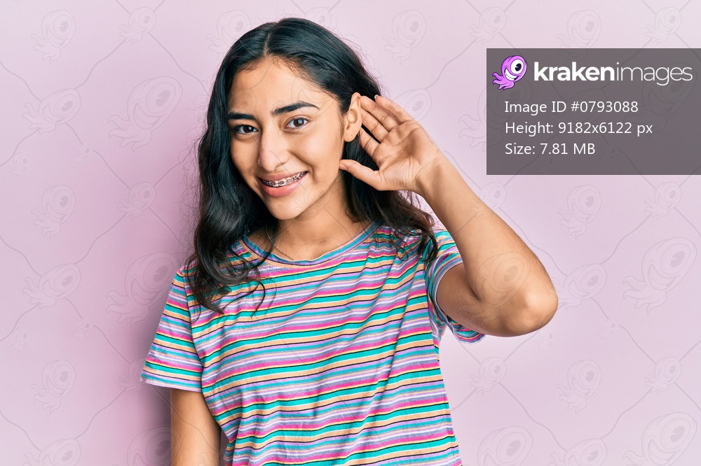 Hispanic teenager girl with dental braces wearing casual clothes smiling with hand over ear listening an hearing to rumor or gossip. deafness concept.