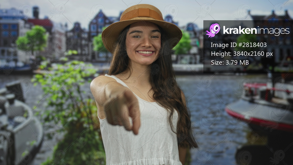 Hispanic teenager wearing summer hat smiles and points finger forward in street; joyful connection invitation.