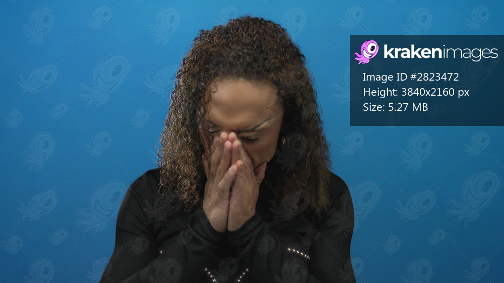 Hispanic transgender woman clutching chest with closed eyes and frowning in blue studio; pain heartattack.