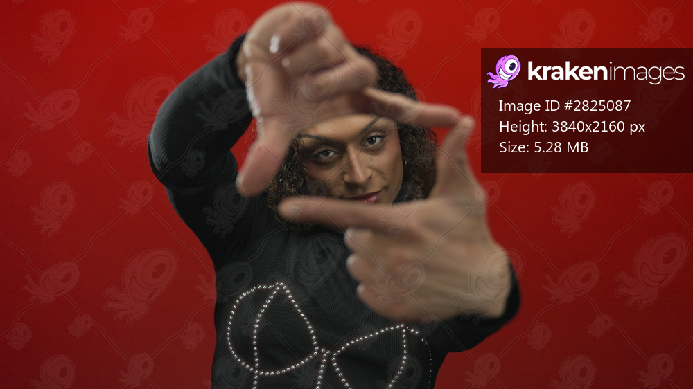 Hispanic transgender woman framing gesture with hands in front of red studio wall with direct gaze; focus.