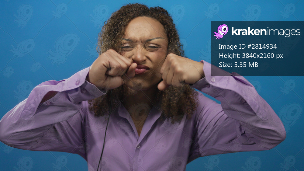 Hispanic transgender woman pouts with clenched fists, tears and headset microphone in studio; frustration release.
