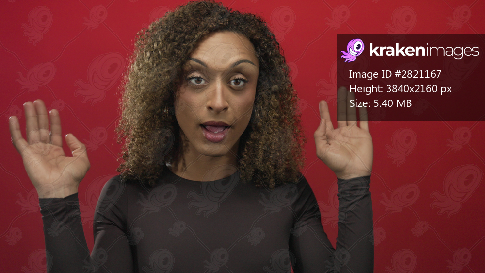 Hispanic transgender woman raises both hands and then covers her face with her palms in studio; playful joy.