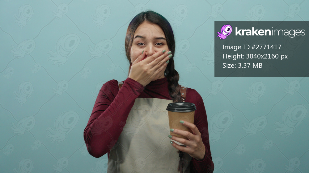 Hispanic waitress in apron smiling with hand over mouth standing against isolated blue background holding coffee cup conveying a playful and cheerful moment of service. - Kraken Images