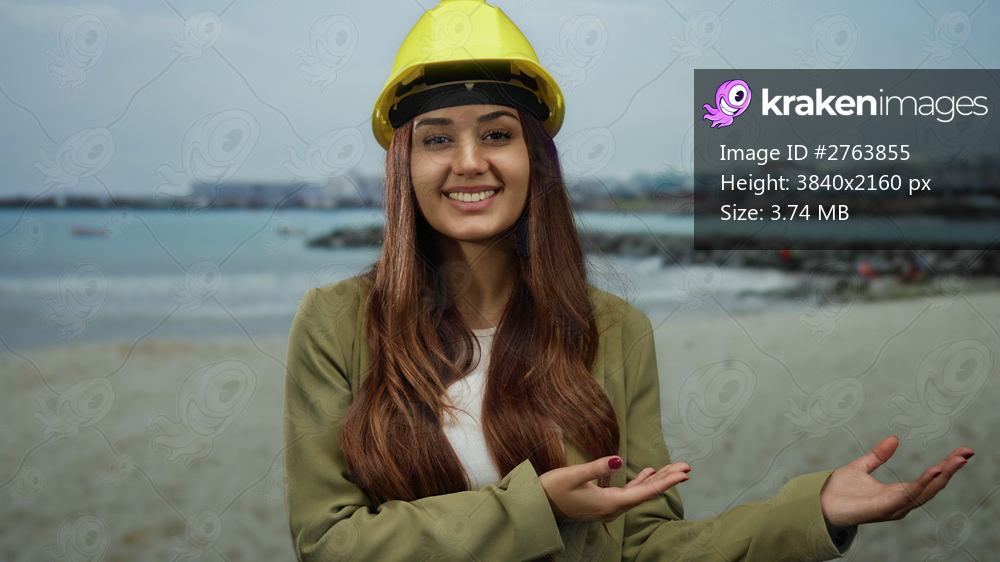 Hispanic woman architect with hardhat gestures thumbs up and points, presenting seaside construction project on a sunny beach.