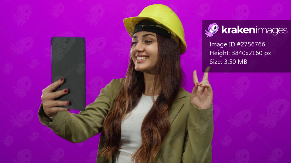 Hispanic woman architect in a yellow hardhat taking a selfie with a tablet against an isolated pink background, showing a peace sign and smiling in a professional setting. - Kraken Images