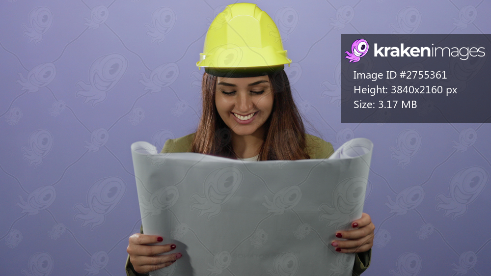 Hispanic woman architect in hard hat with blueprints over isolated purple background smiling.