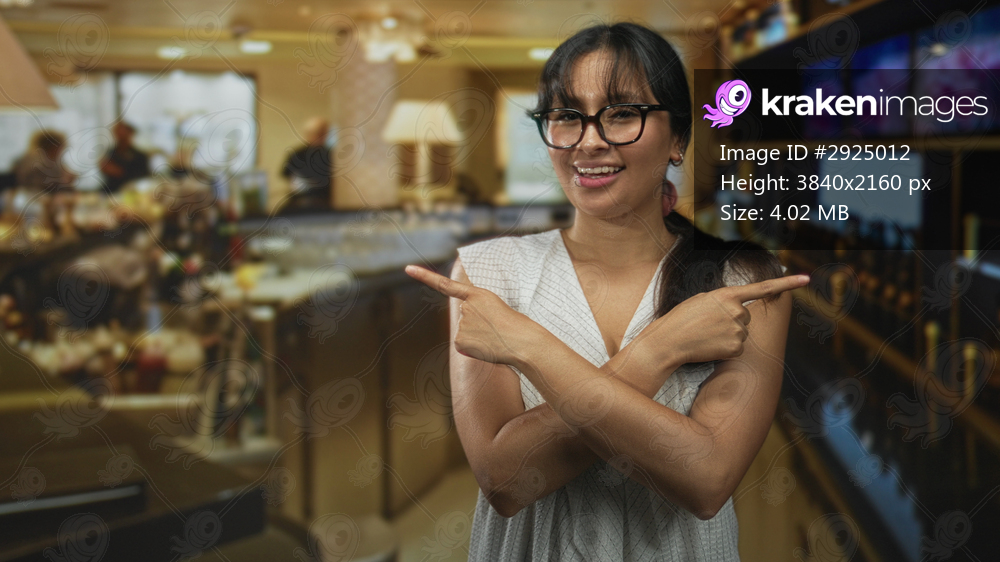 Hispanic woman with arms crossed pointing both fingers to opposite sides at a bar inside a restaurant building, smiling with glasses and brunette hair; playful casual. - Kraken Images