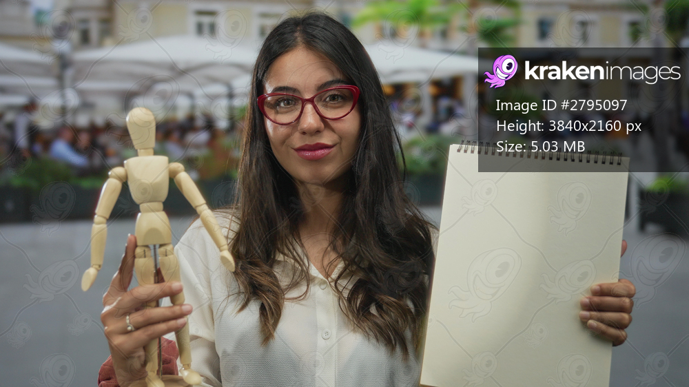 Hispanic woman artist smiles holding notebook and mannequin outdoors at restaurant terrace on lively street.