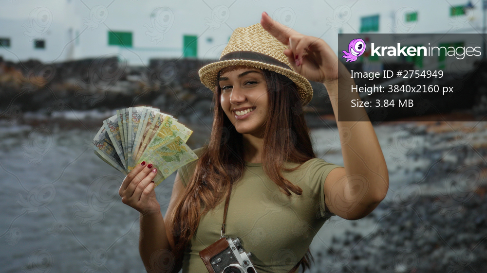 Hispanic woman at seaside holding peruvian soles, smiling and saluting with hat, capturing the essence of a joyful tourist on a beach adventure.