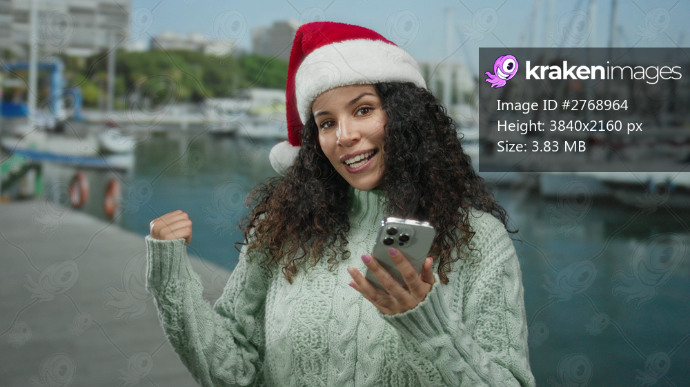 Hispanic woman at seaside port wearing santa hat and sweater holds phone, gesturing with thumb, surrounded by boats in a festive holiday setting.