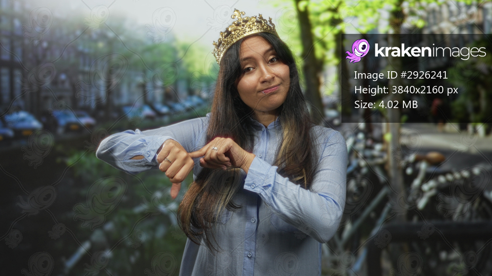 Hispanic woman brunette wearing crown making thumbs down gesture on an amsterdam street with hands pointed down and neutral face; disapproval.