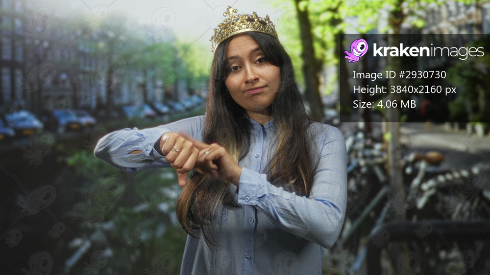 Hispanic woman brunette wearing crown making thumbs down gesture on an amsterdam street with hands pointed down and neutral face; disapproval.